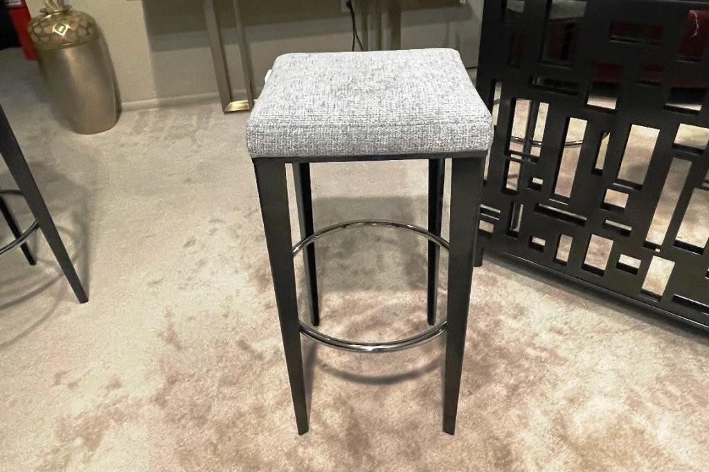 This sleek Barstool is shown with a fabric seat and features a powder coat finish with stainless steel. Other finishes available. Other fabrics and leathers available.