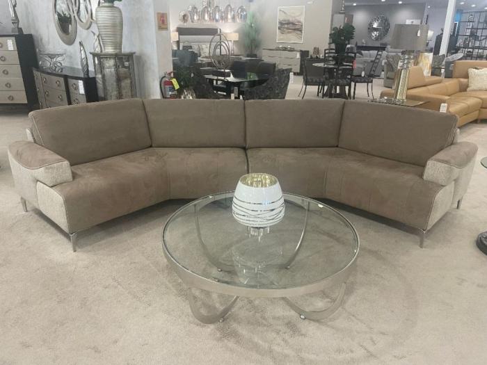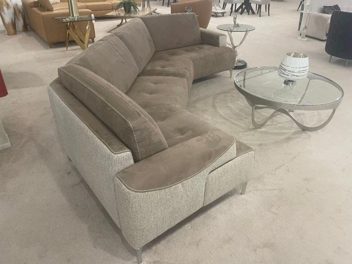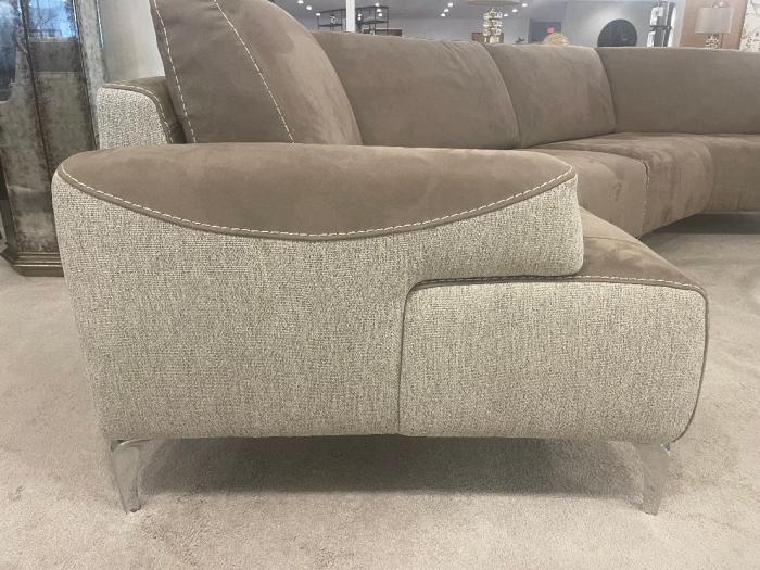 This gorgeous 2 pc. Angled sectional is shown in combination fabric & leather/suede. It features thick contrast stitching and stainless steel legs.Other pieces available. Other fabrics, leathers & leather/suedes available'.