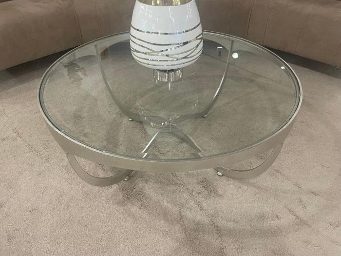Shown with our elegant Cocktail Table that features a clear glass top and a base in silver leaf finish. Other finishes available.