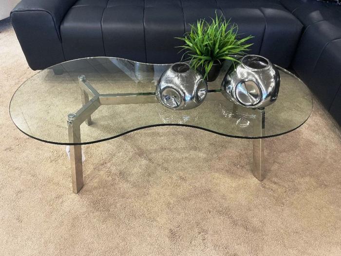 Shown with our contemporary Cocktail Table that features a free form glass top and chrome base.
