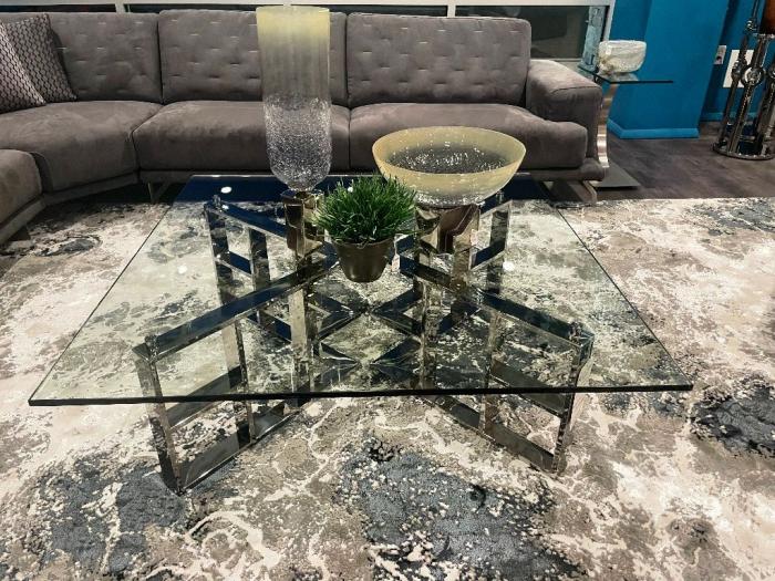 Shown with our Cocktail Table that features clear glass and a polished stainless steel base. Available in other finishes.