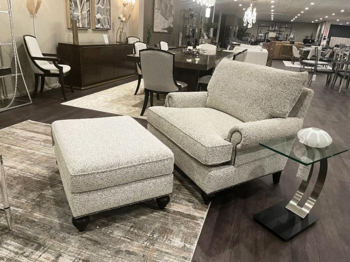 This oversized chair and ottoman are shown with nailhead trim (optional). Available in other fabrics & finishes.