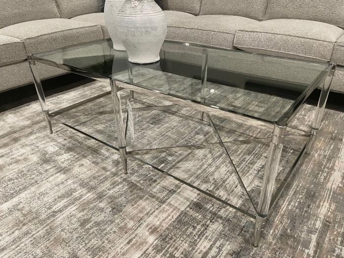 This rectangular Cocktail Table features a glass top with polished stainless steel and acrylic accents. Available in other sizes.