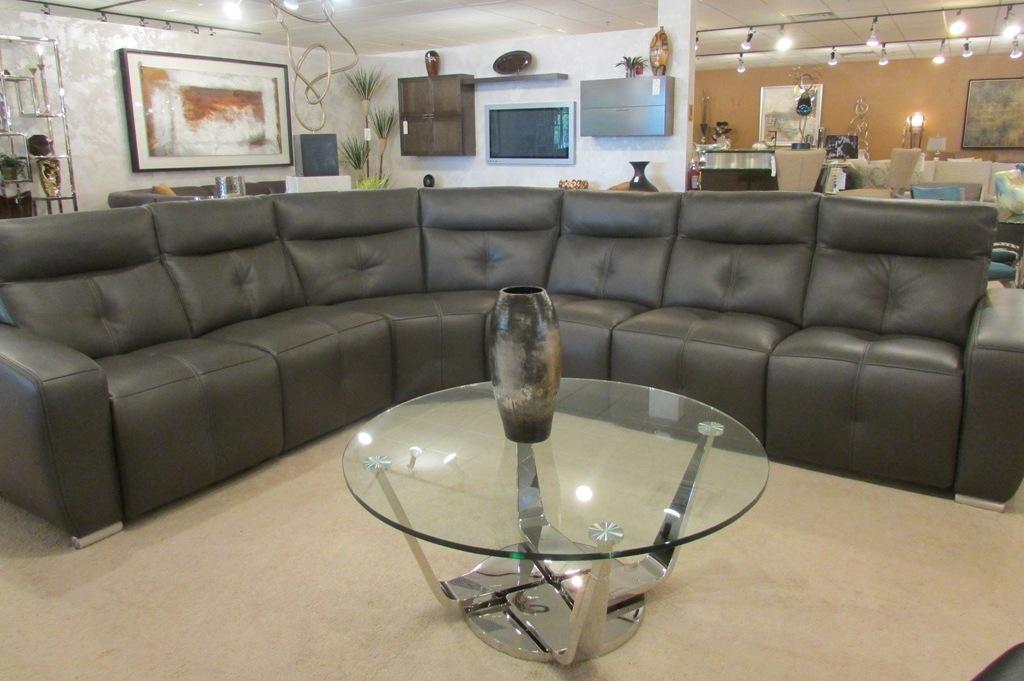 This sophisticated, high-quality leather sectional features 3 motorized incliners and contrast stitching. Available in other pieces. Other leathers and fabrics available as well.