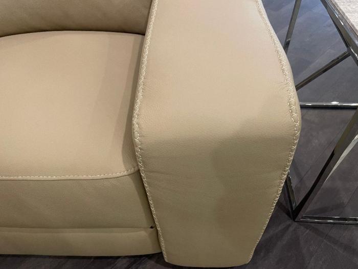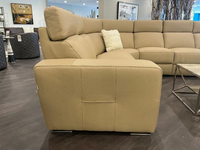 This Gorgeous 6 Pc. Sectional features a motorized recliner & headrest. Shown in leather with stainless steel accents & custom criss cross stitching on arms. Available in other leathers & fabrics. Other pieces available.