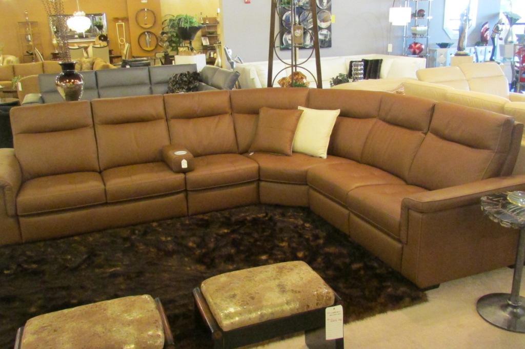 This sophisticated, high-quality leather sectional features 2 motorized incliners, tufted seats and contrast stitching. It's shown with optional cup holder and leather pillows. Available in other pieces. Other leathers and fabrics available as well.