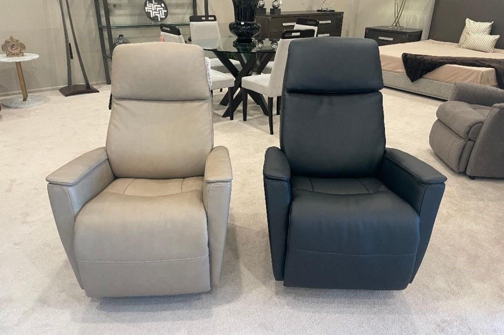 These large and small Swivel-Glider-Power Recliners feature 3 motors for the headrest, footrest and lumbar support. Shown in leather. Available in other leathers and fabrics.