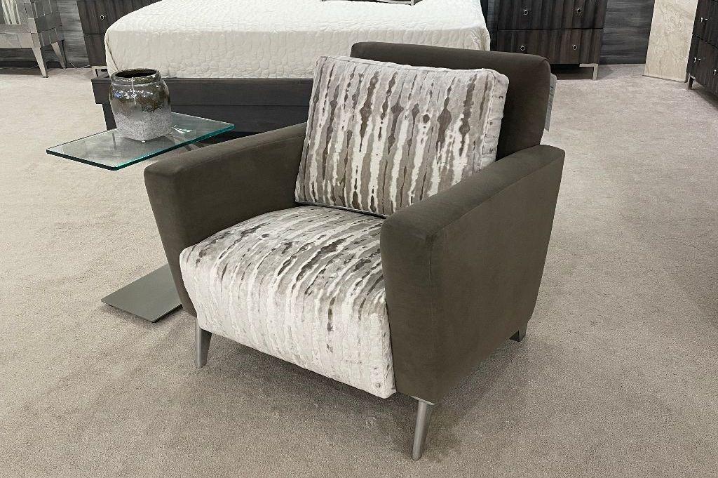 This gorgeous Occasional Chair is shown in combination fabric with metal legs. Available in other fabrics.