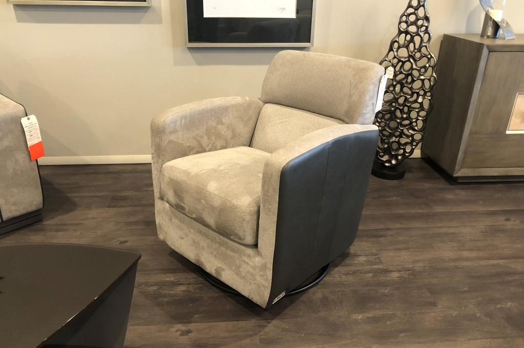 This Swivel Rocker Chair is shown in combination Leather and Fabric. Available in other Leathers and Fabrics.