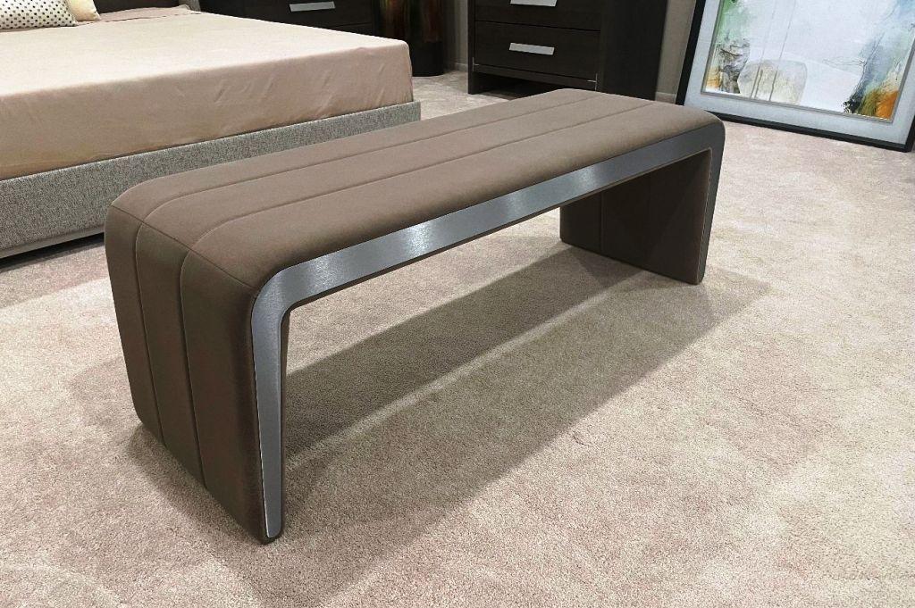 This Upholstered Bench features a brushed stainless steel trim. Available in other fabrics.