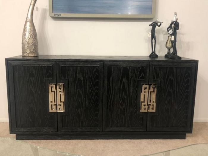 This gorgeous Wood Credenza fetaures mahogany and oak woods with anthracite finish and bright nickel hardware. Only available as shown.