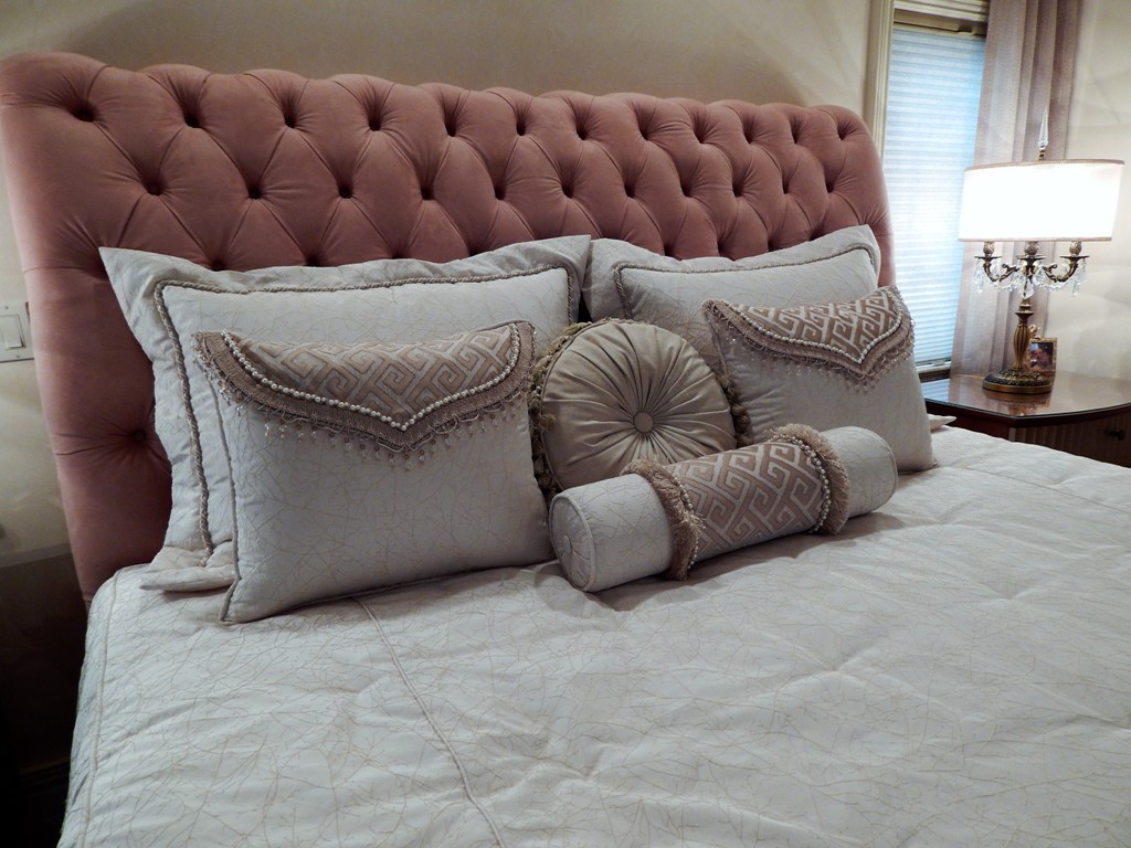 This sensational Master Bedroom was custom designed by Bob Berry. From the gorgeous wood furniture to the luxuriously upholstered headboard and occasional chairs, Bob designed every piece and had every piece built by our custom shops. The detailing is amazing! And his custom designed bedding and drapery gives this bedroom the perfect finishing touches! Great Job Bob!